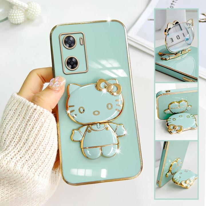 TA for OPPO A57 2022 / A77S Back Cover Hello Kitty Mirror Bracket Luxury 6D Plating Case Soft Silicone Square Phone Case for Girls