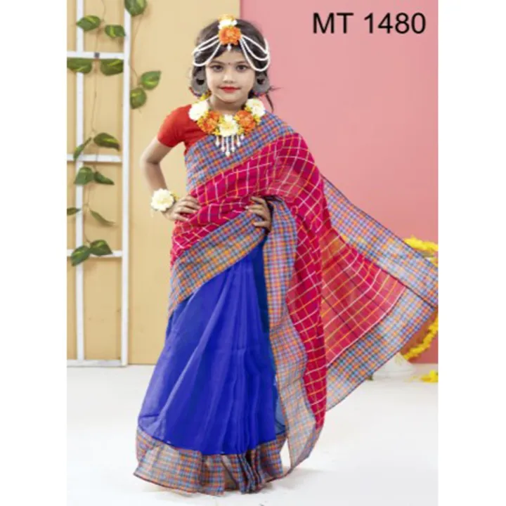 Tangail Tat বাচ্চা মেয়েদের জন্য বিভিন্ন রঙের রেডিমেড হাফ সিল্ক শাড়ি (কোমর থেকে পা: 28 ইঞ্চি লম্বা)