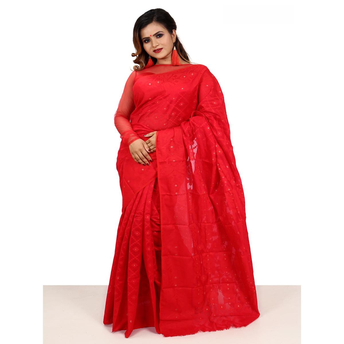 Tangail Tat মহিলাদের জন্য লাল রঙের হাফসিল্ক জামদানি শাড়ি