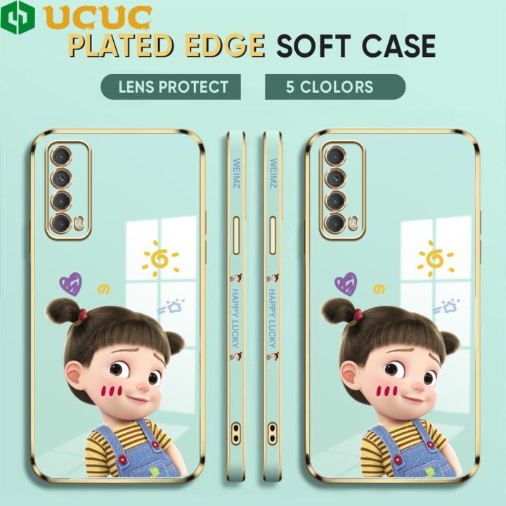 UCUC for Huawei Y7A Back Cover + Free Lanyard Lovely Girl Luxury 6D Plating Case Side Pattern Soft Silicone Square Phone Cases