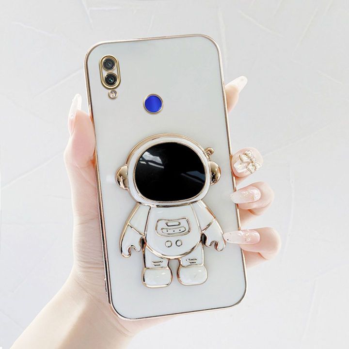 UCUC for Redmi Note 7 / Note 7 Pro Back Cover + Free Lanyard Creative Cute Astronaut Folding Bracket Luxury 6D Plating Case Soft Silicone Square Phone Cases