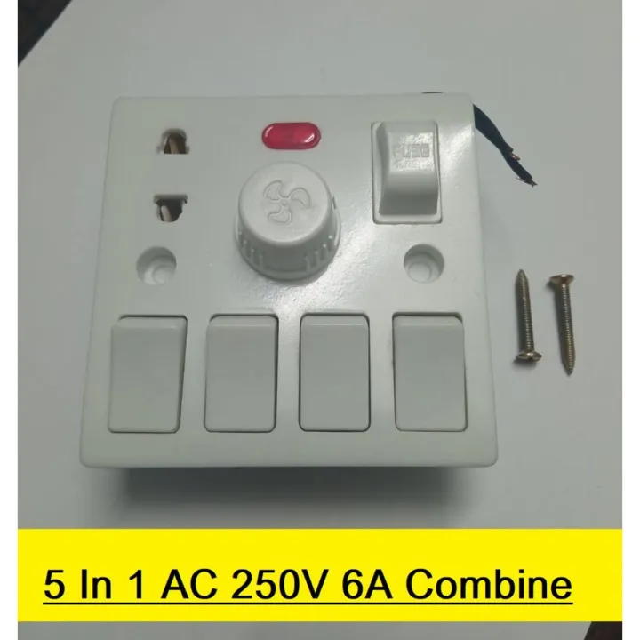 Universal 5 In 1 AC 250V 6A Combine 4 Pcs Gang Switch + Fan Dimmer Regulator + 2 Pin Socket and LED Indicator + Fuse Combine Wall Gang Switch Box