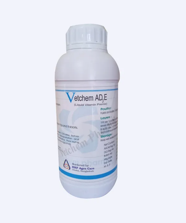 Vetchem Vitamin AD3 Liquid Vitamin Premix Feed Grade Powder for Animals Specially Rooster-chicken, Broilers and layers, Breeders and firms, Goat / Sheep, ভেটকেম এডি৩ই ভিটামিন এ, ডি৩, ই সলিউশন 1000ml
