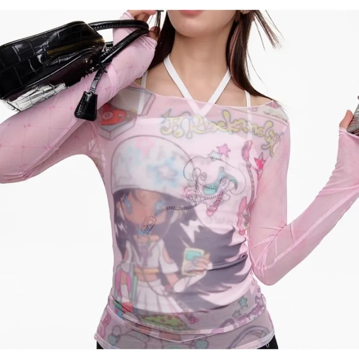 Y2k women clothing Patchwork Mesh Millennium Long Sleeve Shirts Female Top 2024 Popular Harajuku Youthful Tees 2000s Blouses