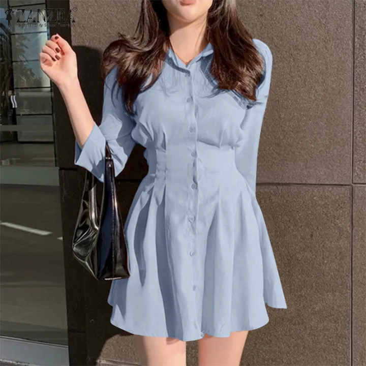 ZANZEA Korean Style Women 3/4 Sleeve Plain Casual Fashion Pleated Tunic Mini Shirt Dress